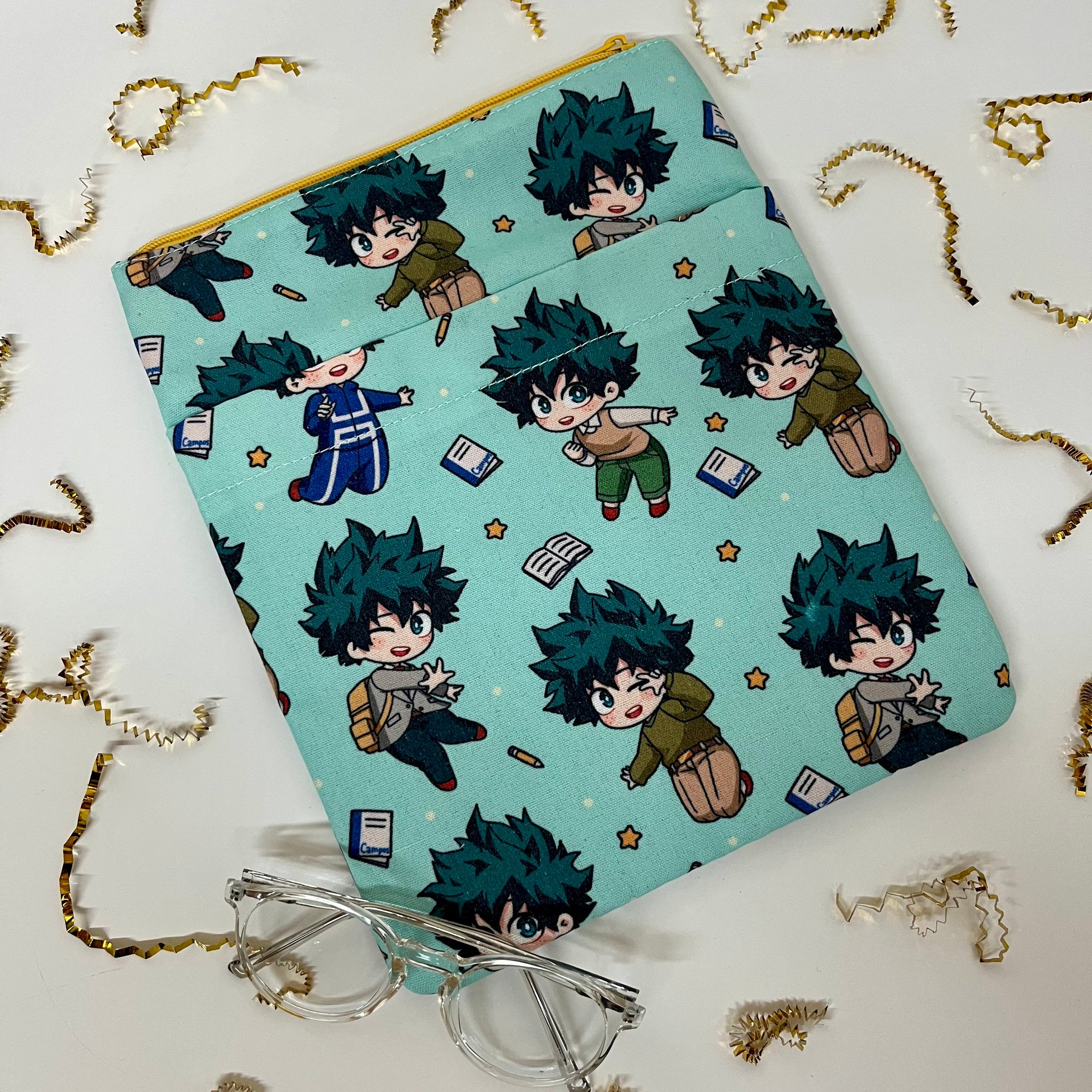 Book sleeve is 11x9" with one main pocket with zipper and a smaller front pocket.